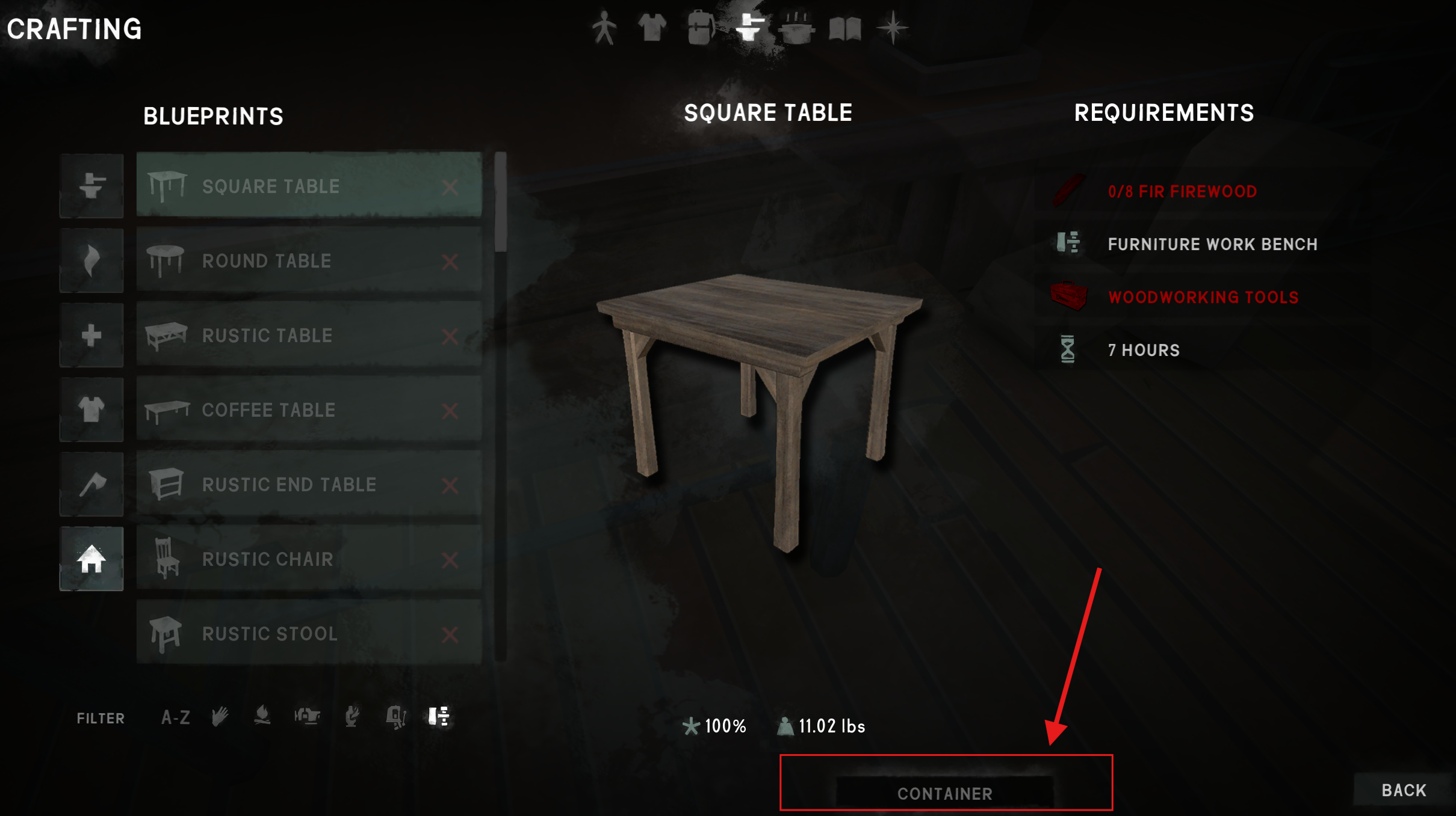 - At the bottom of the screen, select Container. This will open the Furniture Work Bench Container